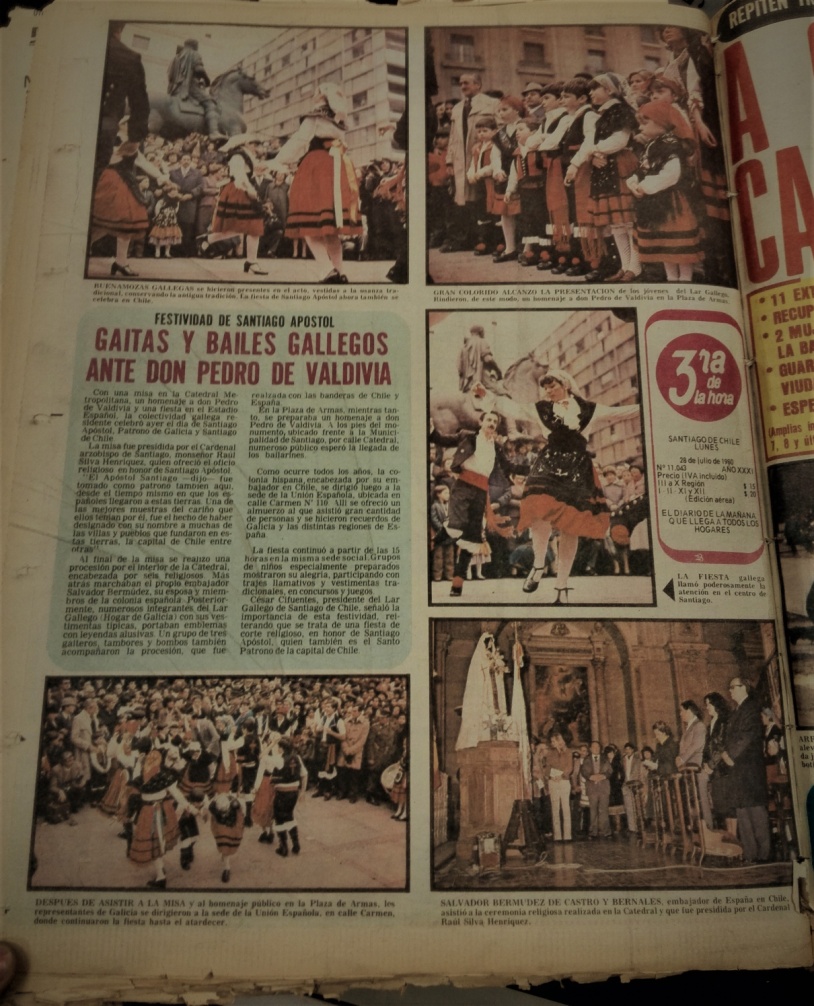 Ya hemos visto cómo los jóvenes que ingresaban al Lar Gallego desde fines de los años 60 recibían una educación musical y artística encaminada a un punto cúlmine celebratorio de la colectividad de raigambre religiosa y sociocultural. Pero además de ello, intencionadamente se fue gestando la idea entre algunos miembros y amigos de la colectividad gallega de que el gallego debía honrar sus tradiciones según sus antecesores lo hicieron, replicando organizaciones e ideales, e institucionalizándolos. Fue así como nació la cofradía en Santiago (que brevemente tuvo filiales en San Felipe y Valparaíso) para celebrar al santo patrono y el Lar Gallego para dar cabida formal y protagonismo a las relaciones sociales de los gallegos. Además se consagraron las Semanas de la Galleguidad o “fiestas compostelanas” previas a la celebración dominical del Apóstol en julio, que buscaban emular aquellas realizadas en Santiago de Compostela donde originalmente solían durar entre una semana y un mes, con romerías, procesiones y bailes típicos; en la capital chilena, en cambio, la colonia gallega fue paulatinamente dándoles cabida durante la semana previa a la fiesta mayor y hasta un mes completo con la realización de campeonatos de tute y fútbol, charlas culturales y fiestas infantiles. Este punto enfatizaba en 1979 el secretario general del Lar Gallego, Ventura Varela García, aludiendo a que dichas fiestas eran tradicionales de Galicia y que “nosotros las recordamos de acuerdo a esa tradición. Allá hay grandes fiestas cada año”[33]. Por otra parte, la celebración dominguera al apóstol no correspondía solamente a la misa y procesión en la Plaza de Armas, sino que también incluía el tradicional Xantar gallego o almuerzo típico en la sede del Círculo Español y posteriormente de la Unión Española, seguido de una visita al Hogar Español[34]. Todos estos eventos y actividades ayudaron a institucionalizar el rescate de la tradición que, si bien pervivía de manera desorganizada e informal entre muchos de sus miembros, adoptó formalidad en un proceso activo y consciente[35].