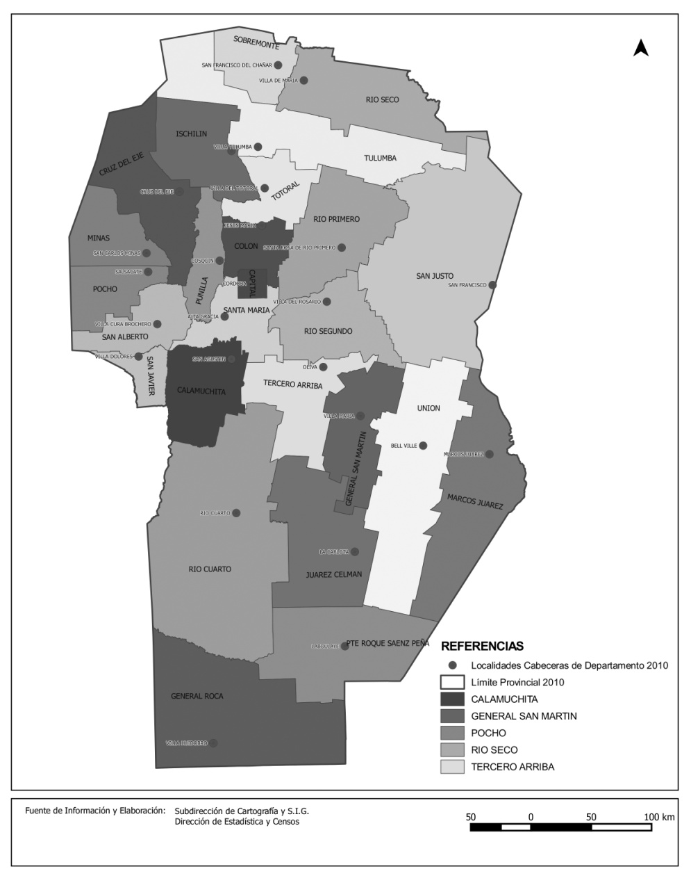 La provincia de Córdoba está ubicada en el centro del territorio argentino y en Figura 1 puede observarse la división política que exhibe en la actualidad. En la historiografía se presenta una regionalización en tres áreas: noroeste, centro y sudeste. El noroeste y centro cuentan con asentamientos europeos estables desde épocas más tempranas, y se caracterizan orográficamente por la prevalencia de sierras, valles serranos y zonas de piedemonte, contrastantes con las llanuras del sudeste[14]. El sudeste provincial experimentó sostenidos conflictos entre españoles y parcialidades aborígenes; dichos enfrentamientos menguaron hacia las últimas décadas del Virreinato y dificultaron la perdurabilidad de los asentamientos españoles conformados durante el período colonial[15]. Durante este último, y ya entrado el período independiente, no existían regiones especializadas en actividades económicas particulares, si bien la serrana (noroeste y centro) tenía una producción más diversificada y concentraba la mayor proporción de la población provincial, con una densidad poblacional más elevada[16].
