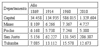 Variación diacrónica del total poblacional en los departamentos Capital, Minas, Pocho, San Justo y Tulumba a través de los censos nacionales de 1869, 1914, 1960 y 2010[25].