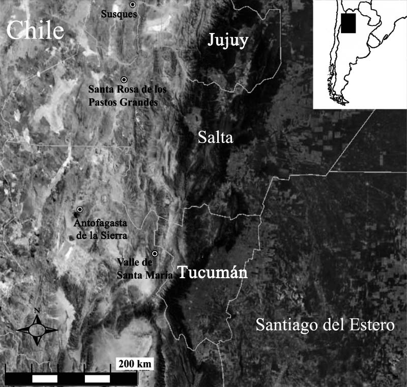 En este trabajo se analizarán comparativamente dos conjuntos de artefactos constituidos por puntas de proyectil. Los mismos provienen de dos áreas de estudio del NOA, a saber: el sur del valle de Santa María (2000 msnm, figura 1), Catamarca, y la cuenca de Pastos Grandes (4000 msnm, figura 1), puna de Salta. Dichas áreas se encuentran a una distancia de 200 km entre sí. El conjunto del valle de Santa María fue reunido a partir de recolecciones superficiales y colecciones depositadas en museos. Por su parte, el conjunto de la cuenca de Pastos Grandes (4000 msnm, figura 1) está compuesto por puntas de proyectil recuperadas en la estratigrafía del sitio Alero Cuevas (4400 msnm), el cual posee fechados absolutos extendidos a lo largo del Holoceno[8].