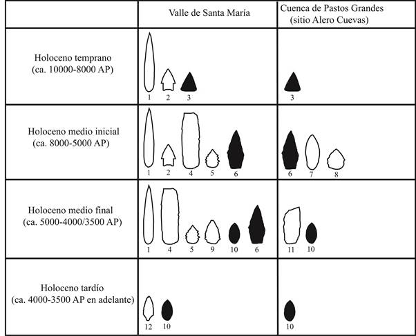 Tal como se destacó, en total se distinguieron doce tipos, considerando los conjuntos de las dos áreas de estudio, los cuales mediante una comparación con los materiales del sitio Alero Cuevas, así como con los materiales de diferentes sitios en el ámbito regional, pueden ordenarse dentro de los bloques temporales correspondientes a Holoceno temprano y a inicios del Holoceno tardío. Entre los doce tipos, se identificó un total de tres que coinciden tanto en la cuenca de Pastos Grandes –sitio Alero Cuevas- como en el valle de Santa María, mientras que tres de estos tipos sólo se identificaron en la primera y seis en la segunda.
