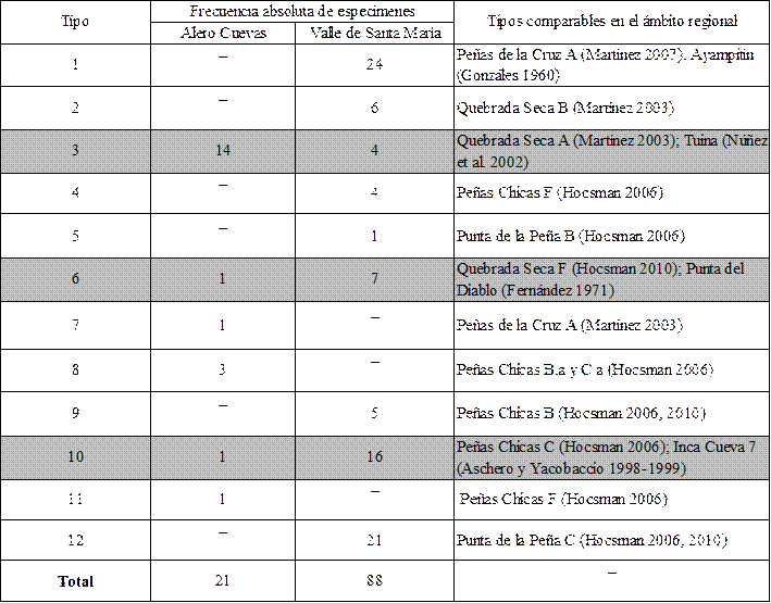 Tabla 1: Frecuencias absolutas de especímenes por área, correspondientes a los tipos identificados. Se marcan en gris los tipos en común entre el valle de Santa María y la cuenca de Pastos Grandes. Se agregó el tipo comparable para las puntas 7 y 11.