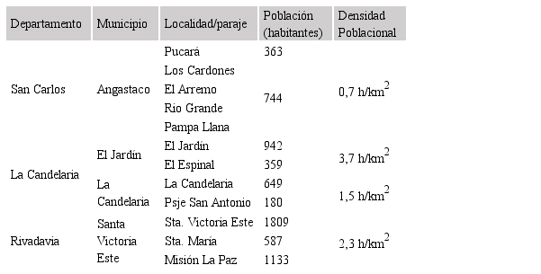 Los casos resultantes: 1) Zona Oeste -Dpto. San Carlos, Municipio Angastaco-; 2) Zona Sur -Dpto. La Candelaria, Municipios El Jardín y La Candelaria- y 3) Zona Este -Dpto. Rivadavia, Municipio Santa Victoria Este-, se referencian en la figura 1.