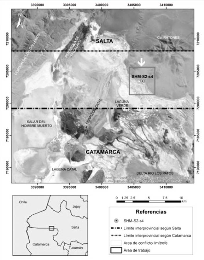 El salar del Hombre Muerto se encuentra comprendido dentro de los límites de la provincia de Catamarca (departamento Antofagasta de la Sierra) y la provincia de Salta (departamento Los Andes). Como es bien sabido, la porción limítrofe de este salar, al norte, se encuentra en litigio entre ambas provincias. Justamente, el sitio que aquí presentamos se encuentra localizado en esa porción del salar bajo disputa legal (figura 1).