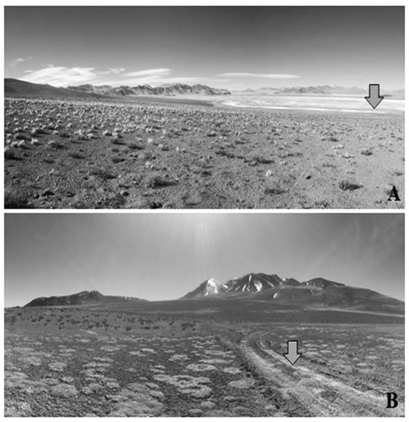 Por otro lado, ciertos sectores del área donde se localiza el sitio fueron impactados en tiempos recientes. Muy cerca de la ubicación del parapeto se realizaron tareas de extracciones de áridos (cantera), como también se conformó una huella minera. Además, muy cerca del parapeto se formaron naturalmente carcavamientos. Mientras que una porción de la zona de dispersión de los materiales fue impactada por otras huellas que se desprendían de la mencionada anteriormente. Estas huellas se ubican dentro del sector de contacto entre el salar y la porción distal de piedemonte y una de ellas se interna hacia el norte, dirigiéndose posiblemente hacia el cerro Ratones (figura 2B). Debe señalarse que estos impactos se produjeron en sectores donde el registro de materiales no es muy cuantioso, concretamente en sectores limítrofes del sitio. Según lo observado, el paso de automóviles produjo el desplazamiento lateral de algunos materiales y, probablemente, que algunos de ellos quedaran cubiertos por sedimentos.