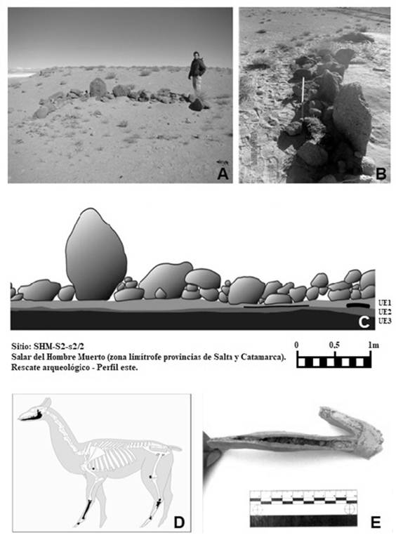 Los restos óseos recuperados en la excavación fueron analizados en el laboratorio de la Cátedra de Biología de los Cordados y de Ecología en Comunidades Áridas y Semiáridas de la Facultad de Ciencias Naturales (UNSa). Se reconoció que un elevado porcentaje de ellos se encuentran en relativo buen estado de conservación, con escaso grado de meteorización (estadio 1 o 2 de meteorización de la secuencia de Behrensmeyer[25]). En esta muestra se encuentran representados huesos correspondientes a distintas zonas esqueletarias, partes del esqueleto axial y apendicular (figura 3D). Asimismo, se estableció que un alto porcentaje de esta muestra puede ser asignado a un mismo individuo. Se trataría de una especie de Camelidae, concretamente una vicuña (Vicugna vicugna)[26]. Este individuo era adulto, basado en el grado de desgaste observado en los molares y premolares. Uno de los registros más interesantes de esta muestra se relaciona con evidencias de marcas-cortes producidas por acción antrópica, específicamente, por el contacto de un filo de instrumento sobre los huesos. Posiblemente esto se debiera a la realización de distintas actividades de procesamiento (cortar, raspar, descarne) y consumo. Las marcas antrópicas se registraron tanto en partes del esqueleto axial como del esqueleto apendicular (figura 3E). Sobre la base de otras observaciones obtenidas de este análisis se pudo determinar un escaso registro de restos con evidencia de termo-alteración (1/22), relacionado a una depositación en sectores de combustión. En este mismo contexto, debe señalarse una particularidad en cuanto a la ubicación de los restos óseos en la excavación, algunos de ellos fueron colocados intencionalmente dentro de intersticios que se formaban entre las piedras de la pared de la estructura. Fueron registrados siete de estos casos, siendo el más relevante una mandíbula inferior casi completa de camélido[27].