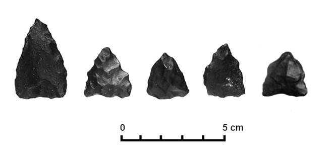 Sobre la base de los fechados obtenidos al presente, en el norte de Chile las PPTA han sido clasificadas dentro de dos fases: Tuina (entre ca. 11000 a 8200 años AP) y Tambillo (entre ca. 9600 a 8000 años AP). Las puntas Tuina se distinguen por presentar base recta o redonda y confeccionadas en formas base en el que el eje técnico es diferente al eje morfológico. Mientras que las puntas Tambillo presentan forma “cupuliforme” y base levemente escotada. En el NOA las PPTA se distinguen muy especialmente ya que son las únicas clases de puntas de proyectil halladas en estratigrafía con los fechados más tempranos. Concretamente, estas puntas se encuentran dentro de un rango temporal comprendido entre 10620 a 8280 años AP[43]. En la Puna de Salta fueron halladas en la capa F4 de Alero Cuevas en contextos culturales con fechados comprendidos entre 9880 ± 100 años AP y 8504 ± 52 años AP[44]. Muy cerca del límite de la Puna salteña este tipo de punta de proyectil también fue hallada en contextos muy tempranos de la Puna de Jujuy, con fechados comprendidos entre 9710 ± 270 años AP y 9150 ± 50 años AP, en el sitio Hornillos 2[45] y 9380 ± 110 años AP – 8980 ± 100 años AP en Lapao 9 y 11 respectivamente[46]. Hacia el sur, en la zona de Antofagasta de la Sierra, puna de Catamarca, las puntas triangulares apedunculadas fueron halladas en los niveles 2b17 y 2b18 del sitio Quebrada Seca 3. Esos niveles cuentan con ocupaciones humanas datadas entre 8660 ± 80 años AP y 8640 ± 80 años AP y fueron clasificadas como Tipo Quebrada Seca A (QSA)[47].
