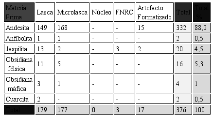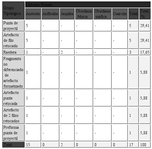 En la tabla 1 se presenta el análisis de la muestra recolectada en superficie de forma sistemática, según materias primas y clases tipológicas. En esa muestra destaca un claro predominio de desechos de talla (n=356; 94,7%) por sobre el resto: artefactos formatizados (n=17; 4,5%) y filos naturales con rastros complementarios (n=3; 0,8%). En este sentido, debe notarse la ausencia de núcleos en la muestra recolectada en el terreno. Asimismo, en las materias primas empleadas se distingue la preponderancia en la utilización de rocas ígneas volcánicas (andesita y obsidiana; 93,6% del total), en contraposición a las rocas metamórficas (anfibolita, jaspilita y cuarcitas; 6,4% del total).