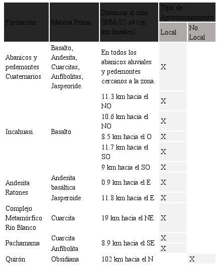 La determinación de las zonas de aprovisionamiento de materia prima se realizó sobre la base de información geológica provista por las Cartas Geológicas de SEGEMAR. De acuerdo a este análisis podemos inferir que la provisión de la mayoría de estas materias primas puede ser considerada local (distancias menores a 20 km desde esas potenciales fuentes al sitio). La única materia prima alóctona es la obsidiana. A continuación, se describen las formaciones que pudieron ser fuente de aprovisionamiento de las materias primas halladas en el sitio, adjuntándose una tabla en la que se especifican las distancias en kilómetros lineales (tabla 2).