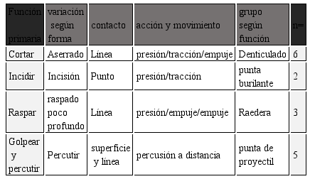 Los instrumentos reconocidos en la muestra fueron escasos (n=17; 4,6%). Primeros análisis sobre esta muestra dieron cuenta de la presencia de siete categorías tecnológicas, ordenadas por materias primas en la tabla 3.