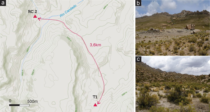 En este sentido, consideramos que Río Candado 2 pudo haberse articulado directamente con el sitio Tabladitas 1 que correspondería a una base residencial, ubicada a solo 3,6 km hacia el sureste de Río Candado 2 (Figura 2a). Tabladitas 1 está emplazado en el fondo de la quebrada homónima, cercano a un curso de agua que desemboca hacia el norte en el río Cincel (Figura 2b). Cuenta con cerámica en superficie, morteros dispersos, y abundantes palas líticas fracturadas. A nivel arquitectónico presenta terrazas agrícolas, corrales y unos pocos recintos habitacionales, habiendo sido la ocupación de uno ellos fechada mediante radiocarbono en el lapso 1312-1432 cal d.C.