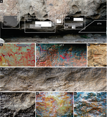 (a) emplazamiento de UT1 en bloque adosado a corral; (b) emplazamiento de UT2 y UT3 en bloque de gran tamaño; (c) detalle de camélido aislado de UT1; (d) camélidos dispuestos en columnas (rebaño) en UT2; (e) detalle de figuras humanas del patrón H5 portando armas en la UT3; (f, g y h) camélidos dispuestos en fila en los calcos digitales de las UT4, 5 y 6 respectivamente