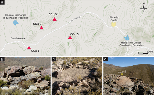 (a) Ubicación de Casa Colorada 1, 2, 3 y 5. La flecha amarilla corresponde a la ubicación del Abra de Queta, las flechas azules indican conexiones de la senda de tránsito que pasa por el lugar; (b) emplazamiento de Casa Colorada 1; (c) detalle de una estructura excavada en Casa Colorada 2; (d) emplazamiento en cima de loma de Casa Colorada 5