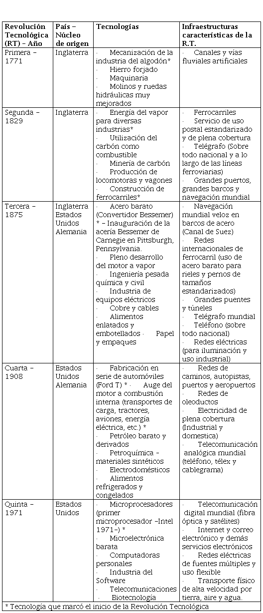Desde que en 1771 abrió sus puertas la hilandería de Richard Arkwright en Cromford, inaugurando la primera revolución industrial, se han sucedido hasta el presente cinco Revoluciones Tecnológicas que marcaron en gran medida el trascurso de la historia (Cuadro 1). Una Revolución Tecnológica (en adelante RT)