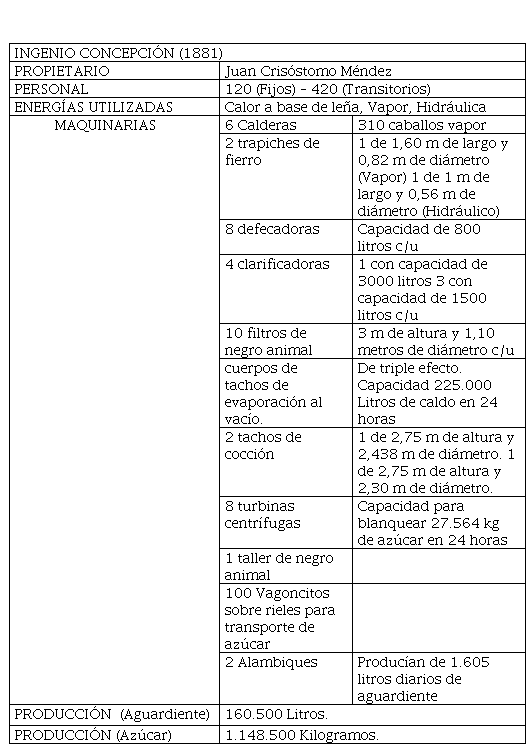 Si bien Bousquet no hace una descripción precisa del ingenio Lastenia, si la hace del ingenio de Juan Crisóstomo Méndez, fabrica que estaba más o menos a la altura de la que abordamos en el presente trabajo; por lo tanto, considerar las características de este ingenio -el ingenio Concepción- nos otorgará una idea aproximada sobre los componentes de la fábrica de Etchecopar hacia 1881 (Cuadro2).