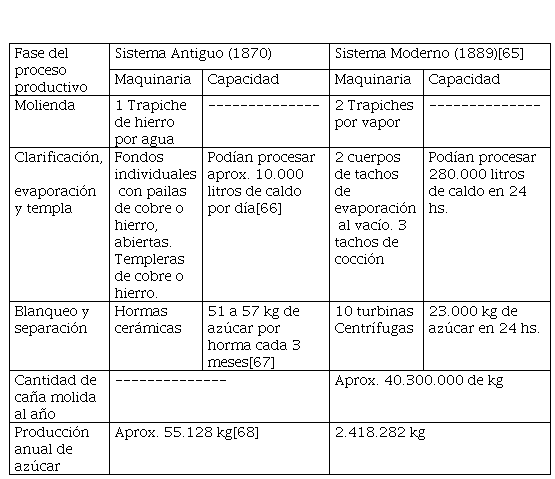 Las modificaciones en el sistema de producción de derivados de la caña de azúcar, estuvieron sujetas a la implementación de un sistema tecnológico completamente nuevo, caracterizado por el vapor como principal fuente de energía y por maquinarias de última generación capaces de procesar cantidades de materia prima inmensamente superiores a las procesadas con sistemas antiguos y a mayor velocidad. Mientras la producción completa de la provincia en 1876 -con sistemas antiguos- alcanzaba los 1.722.750 Kg[20], en pocos años muchas de las fábricas de la provincia superarían esta cifra por sí solas.