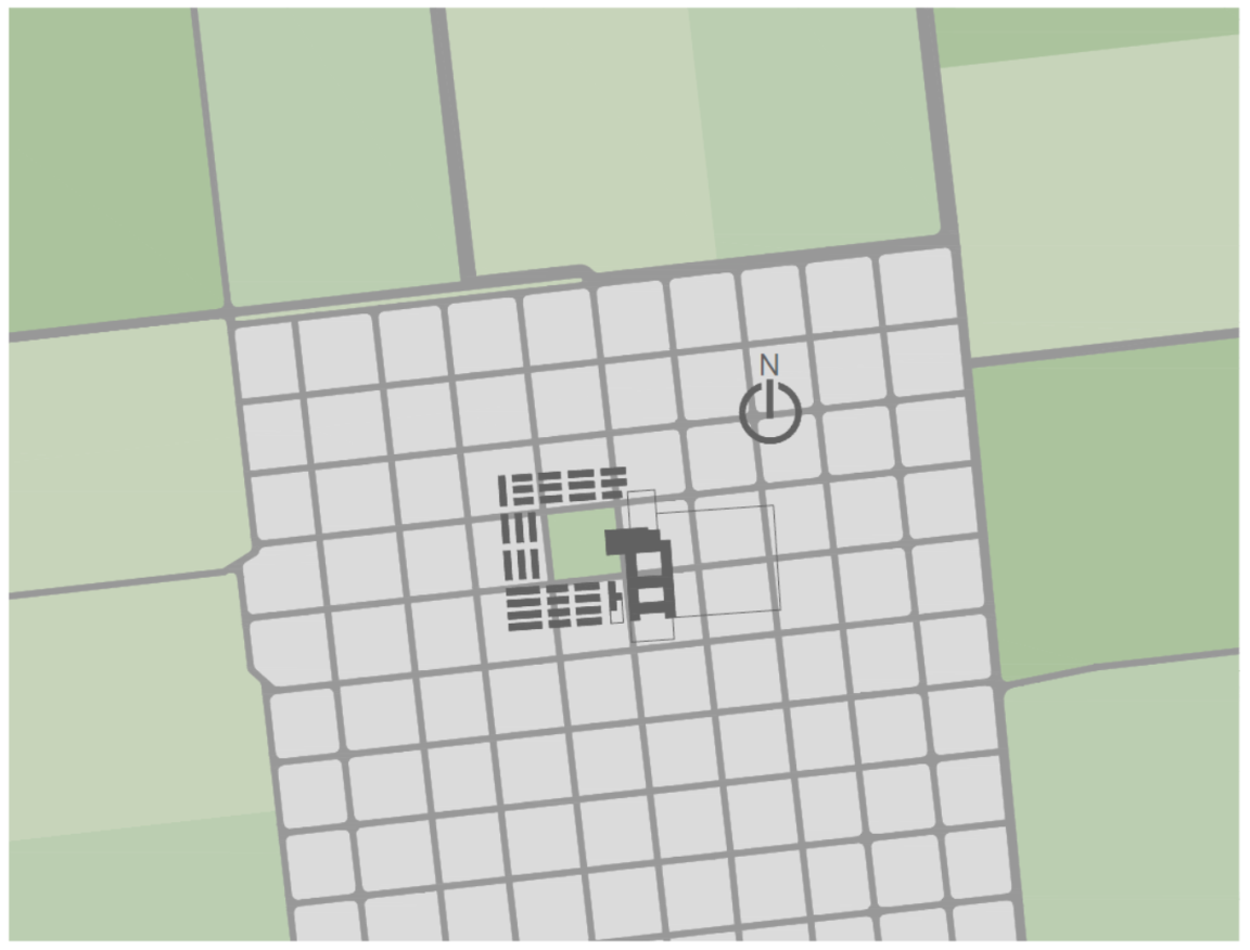 La planificación del trazado urbanístico coincidía con el esquema fijo típico de las reducciones emplazadas en estos territorios; una gran plaza central constituía el corazón de cada poblado, ancha de cien metros y larga de unos ciento treinta, donde se erigía una cruz imponente, acompañada, con frecuencia, con estatuas de la Virgen y del santo patrono del poblado. En la plaza se centraba la vida social de la comunidad: al frente y ambos costados se encontraban la iglesia, el colegio, el cementerio, los talleres, las viviendas de los misioneros y el cotiguazu, mientras que en los laterales se ubicaban las viviendas de los guaraníes, dispuestas en largas filas barriales paralelas, que partían desde el centro hacia la periferia[6], rematando en la entrada principal, a cuyos costados habían otros edificios públicos como el cabildo y los depósitos, entre otros (figura 2).
