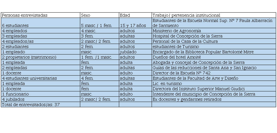 Se realizaron diálogos abiertos y entrevistas semiestructuradas, tanto a personas nacidas en la misma localidad como a las que se encuentran viviendo en el mismo lugar por un tiempo mayor a diez años. Las entrevistas fueron realizadas a grupos que se encontraban juntos en algún punto en común (como un lugar de trabajo o espacios públicos, como la plaza), en viviendas y en otras locaciones del casco urbano. En cada caso se consideró la estructura etaria, sexo, ocupación y si pertenecían a alguna institución (escuelas, Casa de la Cultura, Municipalidad, entre otros) (tabla 1).