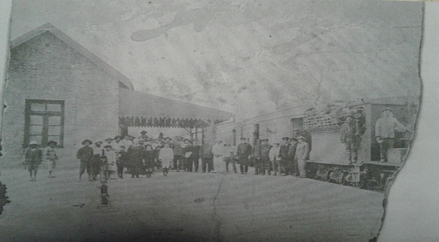 Detalle de imagen: Arribo de la primera maestra a Campo Gallo. Fuente: colección personal de Lucio Riso Patrón. Captura el arribo de la primera maestra a Campo Gallo, Departamento Alberdi, en 1919. Según Riso Patrón, en la fotografía puede verse un fuerte contraste entre colectivos: En el medio de la escena se encuentra la maestra Sofía Franzzini Bravo, oriunda de Ramo Mejía. Hacia la izquierda y detrás de la maestra se concentran los “paisanos” de nativos de la zona, los cuales se encuentran vestidos con sombreros de cuero, chiripas y están descalzos. Del lado derecho se observan operarios del Ferrocarril junto a una pareja destacada del pueblo que según el Riso Patrón podrían ser propietarios del primer obraje.