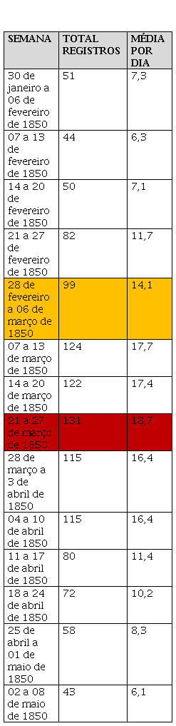 Segundo o relato do médico José Pereira Rego - presidente da Academia Imperial de Medicina e da Junta Central de Higiene Pública -, março foi o mês em que a epidemia fez mais vítimas na cidade, ultrapassando a quantidade de 90 mortos no dia 15[25]. Para identificar de que modo esta afirmação transparece em nossa amostragem, agrupei os assentamentos por intervalo semanal entre o início de dezembro de 1849 e 31 de agosto de 1850. Feito isso, identifiquei e recortei o período com maior concentração de falecimentos ao longo do surto epidêmico, cujos índices se encontram no Quadro 1. Para evidenciar o que podemos considerar aqui como o pico da epidemia nas quatro freguesias analisadas, usei cores que identificam o gradativo aumento/diminuição dos índices semanais (em amarelo e laranja), o momento de intensificação das mortes (em vermelho) e a semana com o maior índice de óbitos (em vinho). Neste recorte, é possível verificar que a concentração dos falecimentos ocorreu entre 21 de fevereiro e 01 de maio[26], sendo o intervalo de 7 de março a 10 de abril a fase de pico dos óbitos, cuja concentração se deu na semana entre 21 e 27 de março.