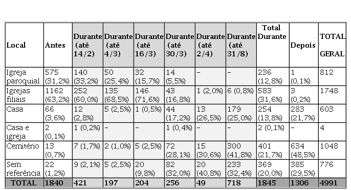 Partindo da normatização eclesiástica estabelecida nas constituições sinodais, a análise se centrou sobre o local de realização das cerimônias e quem as conduzia, se o pároco ou outro sacerdote mediante sua licença. Após morrer tendo recebido os últimos sacramentos[51] no leito de morte, o fiel defunto deixava de pertencer à comunidade familiar, passando em corpo e alma para o domínio da Igreja[52]. As exéquias representavam, pois, o momento em que se concretizava a apropriação do morto pelo clero, tal qual afirma o texto sinodal ao não reputar a residência como o local mais adequado à realização de um ritual eclesiástico por excelência. Os dados da Tabela 1 confirmam essa tendência, no momento anterior à epidemia, quando as encomendações feitas na casa do falecido não alcançavam nem 5% dos casos. Enquanto as igrejas paroquiais representaram 31,2% dos locais de encomendação e as filiais (compreendidas aqui como as de irmandades, ordens terceiras ou conventos situados em cada freguesia) somaram 63,2% dos locais das cerimônias antes da febre amarela, as casas abrigaram uma quantidade significativamente inferior das exéquias (com 3,6%) e os cemitérios um índice menor ainda que as residências (com 0,7%)[53].
