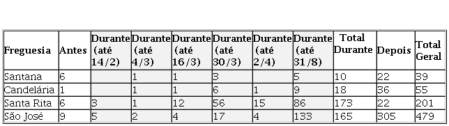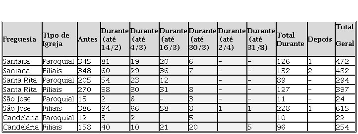 Um destaque a ser feito é que o Monsenhor Miranda Rego era o pároco que atuava em uma das freguesias cujos registros de óbito foram aqui analisados e a computação dos dados sinaliza para uma clara diferenciação no modo como ele procurou manter os ofícios de encomendação sob estrito controle paroquial, diferentemente das outras três freguesias. O Quadro 3 demonstra que Santana foi a única freguesia na qual as cerimônias de encomendação realizadas na igreja matriz não eram tão inferiores em quantidade às feitas em templos de associações religiosas filiais à paróquia, tanto antes como durante e depois da epidemia de febre amarela.