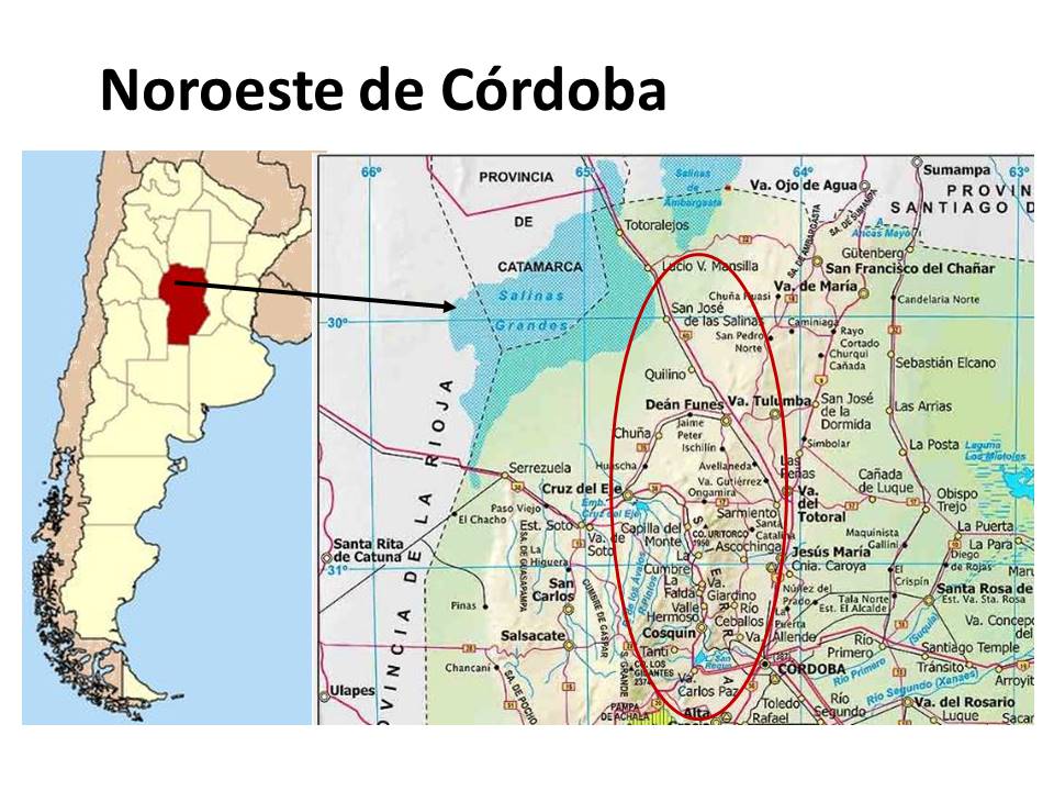 El área de estudio en esta revisión corresponde al sector serrano de la provincia de Córdoba, en el centro de Argentina, (Latitud 29° 39’ – 35° 06’ S, Longitud 61° 54’- 65° 47’ O), que incluye las provincias fitogeográficas Chaqueña y Espinal[10] (Fig.1).
