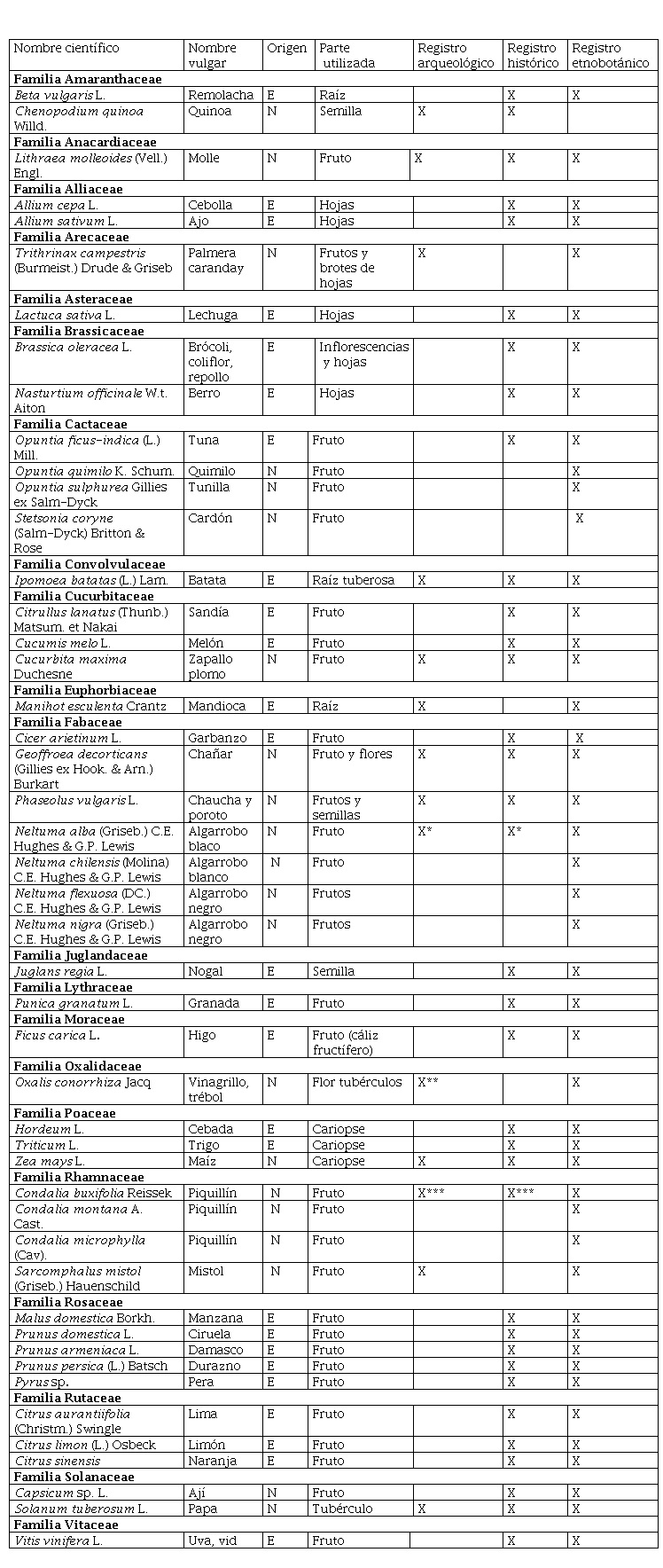 A partir de los datos que se encuentran en las mencionadas publicaciones se elaboró la Tabla 1, que reúne las especies registradas con visibilidad histórica. Se identificó el nombre científico (a nivel de especie cuando fue posible), nombre vernáculo, el órgano utilizado y su origen (nativas o exóticas). Los nombres están actualizados según la base de datos del Instituto de Botánica Darwinion[20] para aquellas que son nativas, adventicias o naturalizadas; para el caso de especies exóticas se utilizó la base de datos de www.tropicos.org. Además, se señaló la presencia de la especie en los restos arqueológicos y la mención en los documentos etnohistóricos, a fin de identificar la continuidad, abandono y transformaciones registradas hasta el momento.