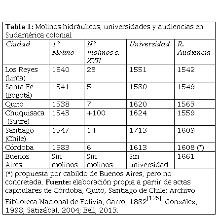 A pesar de todas las expectativas generadas en la región, la propuesta no se concretó, pero contribuyó a formar una corriente de opinión favorable al reconocimiento de Córdoba como plaza adecuada para el asentamiento de instituciones relevantes; en 1613 se eligió la ciudad de Córdoba como sede de la primera universidad en el actual territorio argentino. Nótese que se priorizó esta ciudad antes que la sede del obispado (Santiago del Estero), antes que la capital de la gobernación (Tucumán) y antes que la ciudad-puerto (Buenos Aires). La ciudad que presentaba mejores condiciones para recibir a la comunidad de profesores y alumnos era la que tenía más molinos hidráulicos. El patrón se repitió en otros reinos de América Meridional. Las audiencias y universidades se fundaban en ciudades que disponían de molinos harineros como Santa Fe (Bogotá), Los Reyes (Lima), Quito y Chuquisaca (Sucre), tal como muestra la Tabla 1.