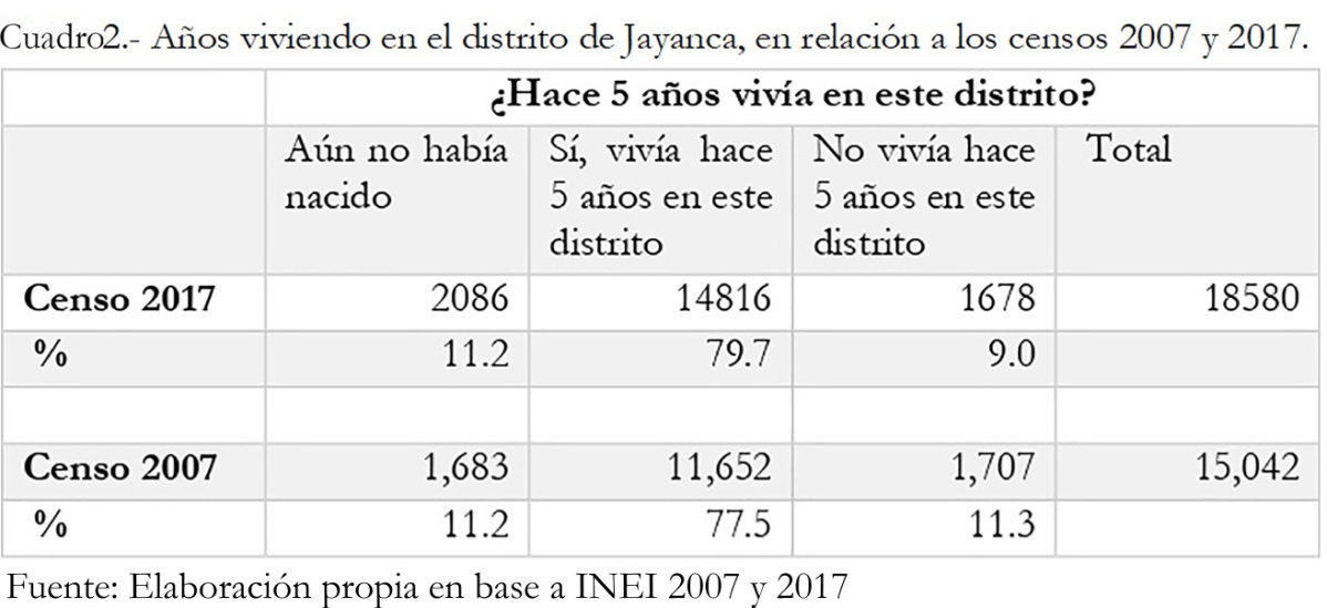 Jayanca presenta uno de los índices más altos de población migrante en la provincia de Lambayeque. Esto ha ocasionado que la comunidad poco a poco sufra cambios sustanciales en su estructura social. De acuerdo a INICAM (2007), Jayanca a nivel de población en el año 2003, inicia un proceso de recuperación de su volumen poblacional debido al desplazamiento de la población motivado por las nuevas oportunidades de desarrollo brindadas en el distrito[59]. En el Censo del año 2007 (INEI), igualmente, un 11.3% se traslada hacia el distrito en un periodo de cinco años; y en el Censo del año 2017, un 9% de personas se había trasladado al distrito en el mismo lapso de tiempo.