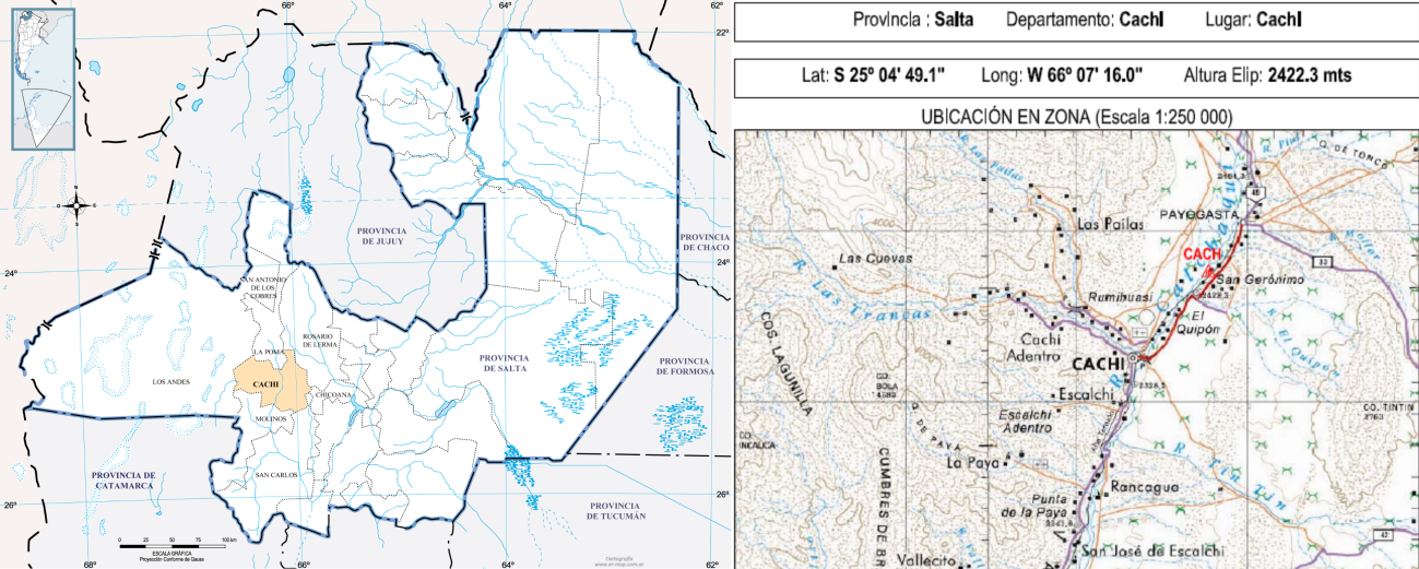El área del Valle Calchaquí comprende una depresión geológica de valles intermontanos con orientación norte-sur, que transcurre a modo de franja a través de las provincias de Salta, Tucumán y Catamarca. De acuerdo con sus características climáticas y geomorfológicas, es posible dividir al Valle Calchaquí en dos sectores, norte y sur. La parte norte o Valle de Arriba tiene una topografía montañosa donde el valle del río Calchaquí es estrecho en su origen en la zona de La Poma, y se va ampliando hacia el sur, en el departamento de Molinos, donde los autores referenciados establecen el límite de esta subdivisión[12]. En esta zona las condiciones son más áridas y posibilitan un uso agrícola entre un 2 y 3% de su superficie[13]. El área que abarca se extiende hasta la quebrada de Angastaco y sierra de Apacheta, incluyendo los departamentos de La Poma con su municipio homónimo, Cachi con las localidades de Cachi y Payogasta, y Molinos, con las correspondientes cabeceras de Molinos y Seclantás[14]. Dentro de esta amplia superficie, nos concentraremos en las localidades de Cachi, Payogasta y parajes aledaños (Figura 1).