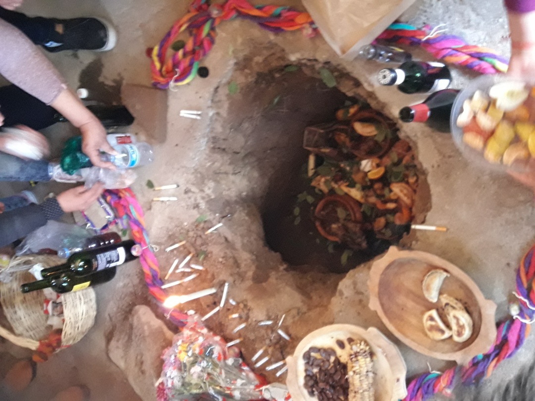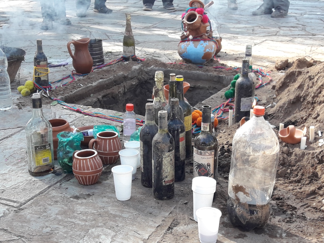Tiempo atrás se hacía Pachamama en la casa pero no le contabas a nadie más que a conocidos, a gente de confianza porque en tiempos de colonización se empezó a privar hasta un punto que el culto a la madre tierra comenzó a ser secreto para la gente que vivía acá en la zona. Ahora va a ser la Pachamama comunitaria acá en la plaza. Y el culto a la madre tierra sabe cómo es ¿no? se convida con la madre tierra misma los frutos que se han cosechado ese año, así que en marzo abril cuando empezamos a juntar la cosecha se va separando el fruto que se levanta: la papa, choclo, zapallo se prepara para comer en agosto recién porque se va a compartir con la madre tierra, por eso se separa, se guarda sin que nadie lo toque nada. Pero ahora ya no, se distorsionó mucho porque ya todo es comprado antes no se permitía comprar cosas para la madre tierra salvo el cigarrillo y algunos lo hacían también, iban a buscar hojas de tabaco de allá de la campaña, de Quijano esa zona pero hubo un tiempo que aquí se cosechó tabaco también, hacía madurar la hoja secar y tenías guardada en una bolsa para armar cigarrillos para la Pachamama. Y después el alcohol se hacía de la fruta: durazno, manzana, uva todo era hecho si todo se elaboraba en la casa para compartir con la madre tierra, no debía intervenir la plata dice como que ella no aceptaba eso, que le des un papel porque no significaba valor era un papel cualquiera. Ahora sí porque ahora todos compran, todo se compra hasta las empanadas se pueden comprar pero la idea era compartir una comida con la madre tierra una vez al año, así como se comparte con las almas también se comparte con la madre tierra y bueno se hace un pozo en el medio del patio en el lugar más importante de la casa y primero se tira agua y se sahuma a la mañana temprano y después ya se va poniendo la comida y compartiendo con toda la gente que tenés ahí en tu casa[41].