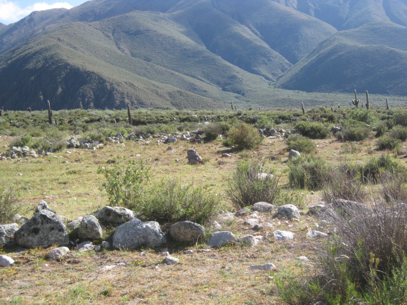 Las Pailas es un sitio con una gran extensión de campos agrícolas, localizado 16 km al NW del pueblo de Cachi, en el departamento homónimo. A partir del relevamiento de las estructuras que se utilizaron para cultivar y de los canales de irrigación que hicieron posible la agricultura[54], se puede identificar un conjunto de bloques de piedra interpretados como huancas, ubicados en medio de las 500 ha de campos que componen lo que dimos en denominar, sectores 1 y 2 del sitio, ambos separados por un cordón montañoso bajo y un camino que lo atraviesa. Se trata de rocas del lugar, de la misma composición metamórfica que los muros que dividen las parcelas agrícolas, aunque con tamaños mucho mayores que la media, de entre 0,50 y 1,50 m de alto y un ancho variable. Lo más llamativo de estas piedras es que se encuentran en medio de los campos, lo que interfiere en las tradicionales maneras de preparación de la tierra para la siembra, como el arado, la distribución de la semilla, así como en las tareas de cosecha (Figura 5).