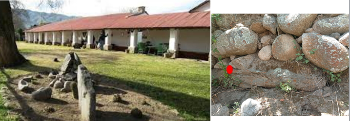 A la izquierda, el frente del casco de la Estancia de Los Cuartos con la exposición de conanas y dos estelas; la que aparece en el centro, adelante, recién se “desenterró” en los comienzos de la década de los 90 (Fotografía que la Estancia expone en internet). A la derecha, sector de pirca (muro de piedra) adonde los pobladores locales escondieron una Piedra Larga (marcada con un punto rojo) en tiempos de la dictadura cívico-militar de los 70, localidad de Casas Viejas