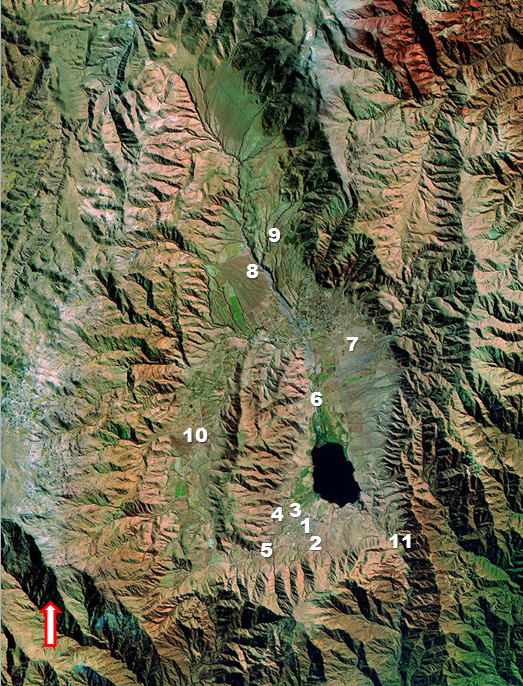 Mapa elaborado por la autora en base a una imagen satelital (Google Earth) del valle de Tafí con identificación numérica de las localidades referidas en el texto.