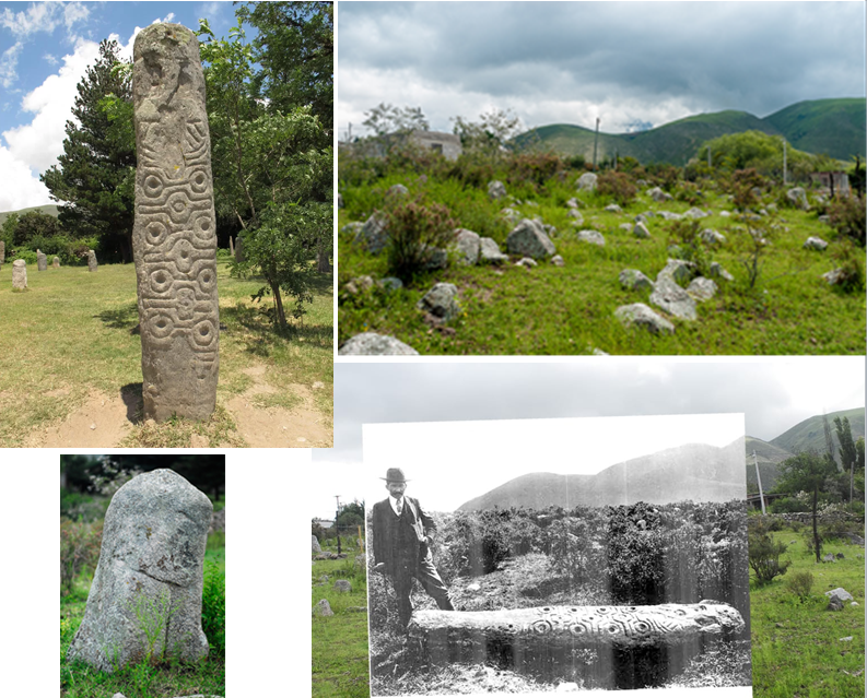 El “Gran Menhir” (o “menhir Ambrosetti) en la Loma del Algarrobo. Arriba a la izquierda la Piedra Larga en el actual Museo a Cielo Abierto en El Mollar; abajo a la izquierda, una piedra-huanca en el contexto arquitectónico ancestral. Arriba a la derecha, el entorno del emplazamiento original, y abajo a la derecha, una superposición fotográfica con una de las imágenes de comienzos del siglo XX, de Carlos Bruch.