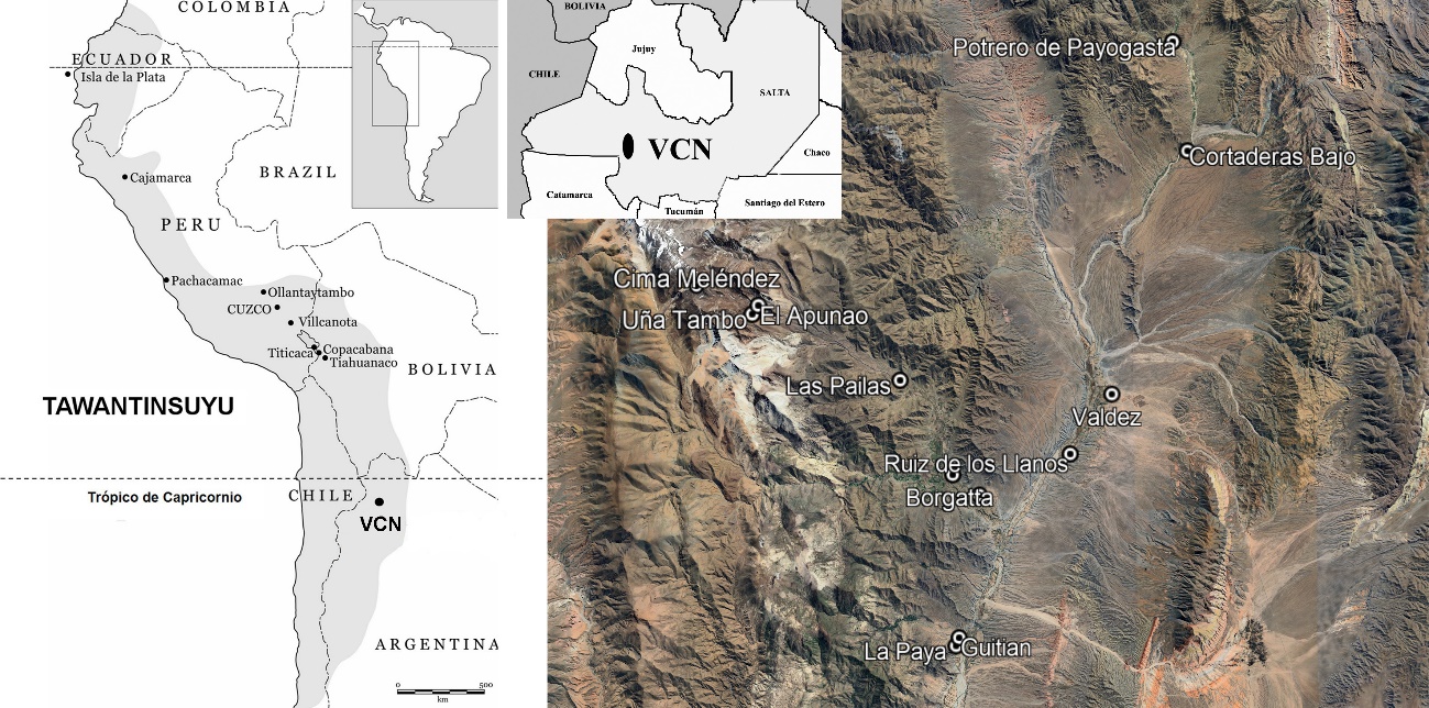 La presencia del Tawantinsuyu (Figura 1) en el VNC se caracterizó por estar focalizada en tres áreas específicas del territorio en donde los inkas instituyeron una relación particular con las poblaciones locales conquistadas y con el entorno natural y las entidades sagradas no humanas que habitaban en él (Acuto y Leibowicz, 2018; Ferrari, Acuto, Leibowicz, Izaguirre y Jacob, 2021a; Leibowicz, Moyano, Ferrari, Acuto y Jacob, 2018).