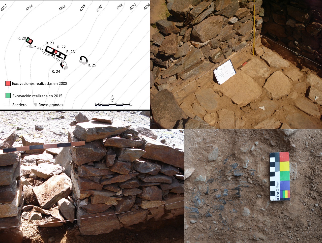 El fechado radiocarbónico proviene de uno de los recintos del sector habitacional, el R20, que se caracteriza por la presencia de elementos arquitectónicos típicamente inkaicos como muros construidos con piedras canteadas, ángulos rectos y un vano de ingreso de forma trapezoidal. El recinto fue totalmente excavado siguiendo niveles artificiales de diez centímetros. En el segundo nivel se halló un piso enlajado que cubría toda la superficie. Debajo de este piso se encontraron rocas pequeñas distribuidas de manera homogénea que formaban la base en donde se apoyaban las lajas. Allí se hallaron los restos de un leño quemado sobre el sedimento estéril, cuyo fechado arrojó un resultado de 520±50 años AP (Ferrari et al., 2021a) (Figura 2).