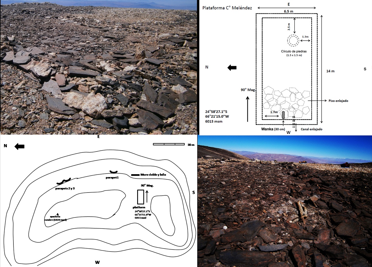 Otro de los contextos inkaicos fechados en esta zona, y que consideramos de gran relevancia, fue el que realizamos en la cima del Cerro Meléndez (6020 msnm). Este cerro, parte del cordón montañoso del Nevado de Cachi, es visible desde gran parte del VCN, y llama la atención por su forma, su altura y por tener su cima nevada casi todo el año. Cuenta con una gran superficie plana en la cumbre donde se construyó una plataforma ceremonial y otras estructuras menores que sirvieron para refugiarse de los fuertes vientos. La plataforma, ubicada a 6013 msnm, es una estructura delimitada por hileras de rocas con su interior plano, mide 14 x 6,5 m y está orientada en sentido E-O en su lado más largo. En parte de la superficie interna se identificó un piso enlajado y una estructura circular de 1,5 metros de diámetro delimitada por piedras lajas. Asimismo, se destaca la presencia de una posible wanka, una piedra amarillenta parada de 30 cm de alto, y un canal enlajado que nace dentro de la plataforma, atraviesa la pared Oeste y continua por cerca de 50 cm en el exterior.