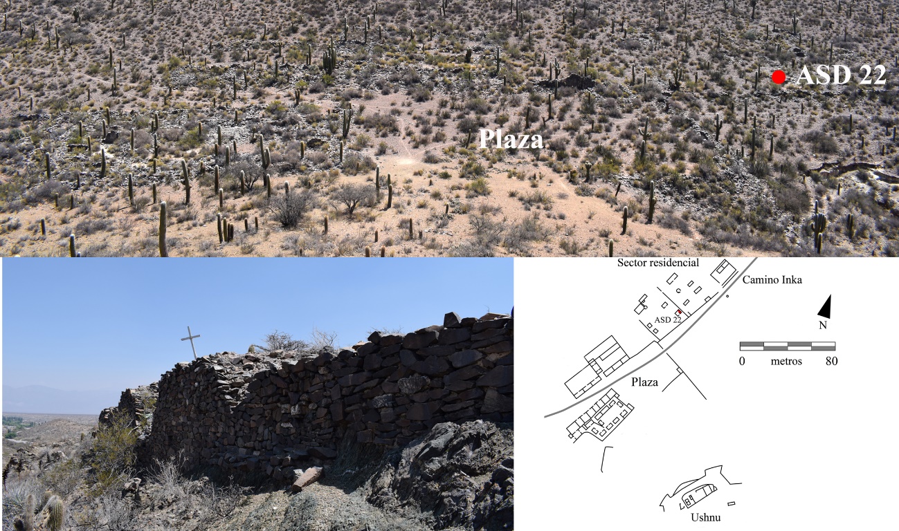 Cortaderas Bajo es un asentamiento inkaico de 4 ha de superficie, localizado a 8 km de Potrero de Payogasta. Cuenta con una imponente plataforma/ushnu emplazada sobre una colina, a cuyo pie se ubica una plaza. En la zona baja se identifican dos sectores, uno que cuenta con dos kanchas típicamente inkaicas y otro con conjuntos de carácter residencial (Figura 5). El fechado radiocarbónico, que proviene de un fogón de poco uso ubicado sobre el nivel estéril de una de las dos habitaciones que conforman recinto ASD22, localizado en el sector residencial, dio como resultado una fecha de 515±38 AP (Gifford, 2003).