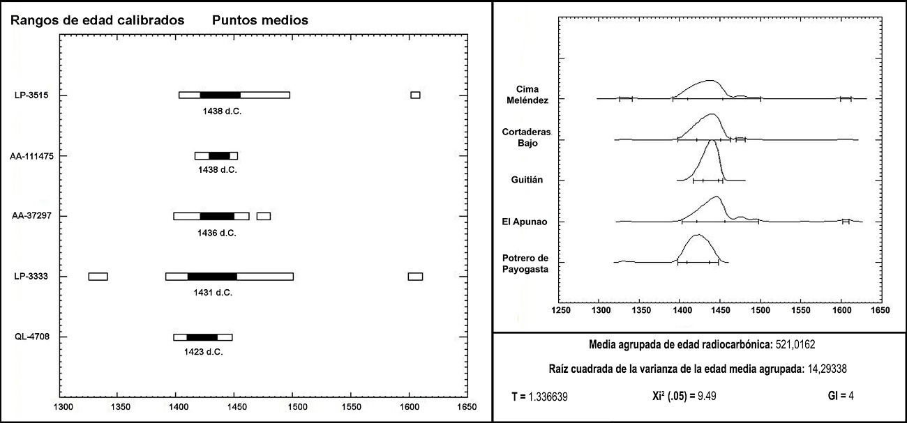 De acuerdo con el promedio y a la curva de calibración del fechado de Potrero de Payogasta se podría postular que este sitio ya estaba ocupado por los Inkas hacia 1423 d.C., mientras que la datación de El Apunao podría indicar una fecha alrededor del año 1431 d.C., 1436 d.C. la de Cortaderas Bajo, entre 1435 y 1438 d.C. el fechado del ushnu de Guitián y entre 1438 y 1445 d.C. el trozo de madera obtenido en la cumbre del Cerro Meléndez. (Figura 6).