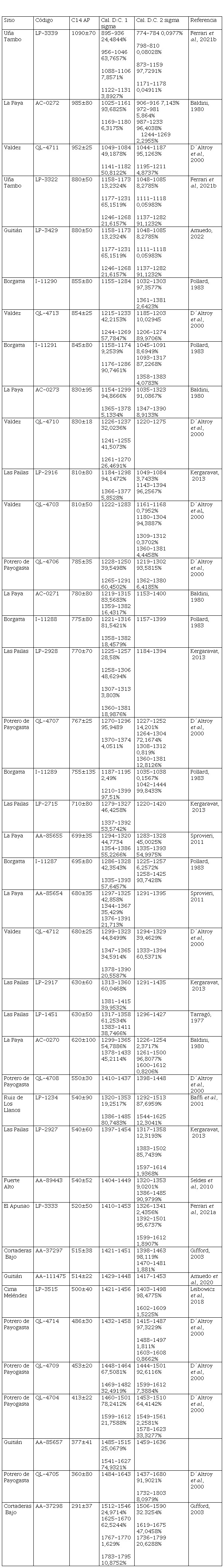 Tomaremos en cuenta 14 dataciones generadas por nuestro equipo de trabajo en los sitios Las Pailas (cinco), Guitián (tres), Cortaderas Bajo (dos), Uña Tambo (dos), El Apunao (uno) y la cima del Cerro Meléndez (uno) y 26 realizadas por otros investigadores y disponibles bibliográficamente. Se tuvieron en cuenta siete fechados de Potrero de Payogasta (D´Altroy y Williams, 1994; D´Altroy, Lorandi, Williams, Calderari, Hastorf, DeMarrais y Hagstrum, 2000), cinco de Valdez (D´Altroy y Williams, 1994; D´Altroy et al., 2000), cinco de Borgatta (Pollard, 1983), seis de La Paya (Baldini, 1980; Sprovieri, 2011), uno de Ruiz de Los Llanos (Baffi, Baldini y Pappalardo, 2001), uno de Fuerte Alto (Seldes, Zigarán y Cabral, 2010) y uno de Las Pailas (Tarragó, 1977). Estos 40 fechados radiocarbónicos fueron calibrados con el programa CALIB, utilizando la curva SHCal20 (Hogg et al., 2020).