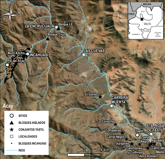 No obstante esta información, muchos sectores aún no han sido explorados y se está lejos de conocer qué ocurre con el arte rupestre entre Incahuasi y Tastil; se desconoce por ejemplo, si estos sitios se articularon espacialmente a partir de otros conjuntos o evidencias, y de ser así, cómo fue esta articulación y en el marco de qué prácticas ocurrió. Para avanzar sobre esto último, se iniciaron prospecciones en las quebradas de Las Cuevas e Incahuasi, entre el Pie del Acay al norte y la localidad de Carrera Muerta hacia el sur. En este trabajo brindaremos información sobre dos nuevos conjuntos rupestres, a los que denominamos Demecia y Cruz, localizados ambos en la quebrada de Incahuasi, entre la localidad arqueológica homónima, al norte, y su intersección con la quebrada de Las Cuevas, al sur. Además, se presentan los conjuntos arquitectónicos espacialmente vinculados a estos: Puesto Vialidad, Corral Dominga, Potrero Justino, Apacheta y Apacheta Llama.