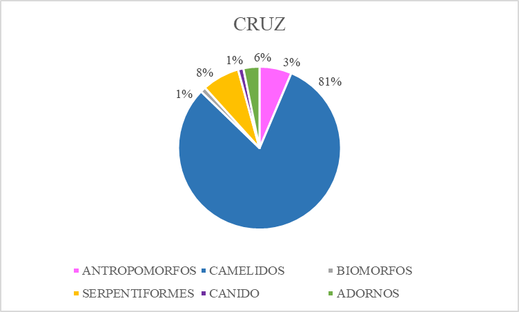 Cruz está conformado por 18 bloques con presencia de grabados rupestres, que incluyen unos 111 elementos (Tabla 1). En este conjunto se registra un alto porcentaje de motivos figurativos (85%), y solo el 12% corresponde a la categoría no figurativos, mientras que un total de 3 elementos (3%) no pudo ser identificado a causa de su deterioro.