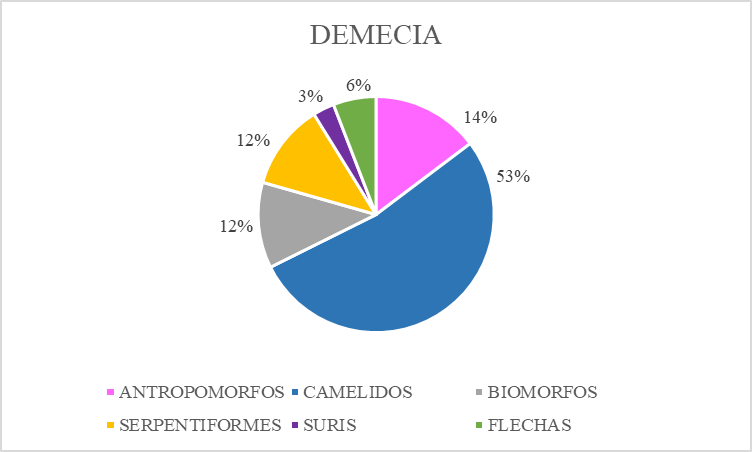 Al igual que ocurre en el conjunto Demecia, los motivos de camélidos son los más representados (n=76), presentes en 8 de los bloques. Son seguidos por los serpentiformes (n=7), antropomorfos (n=6), objetos (n=3) y un cánido (n=1) (Figura 3).