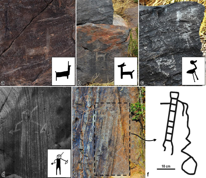 Los antropomorfos son otro de los motivos figurativos presentes, aunque muchos más escasos que los camélidos, también muestran variabilidad en la forma en que son representados. Al respecto, se registran dos motivos prehispánicos y dos posteriores. Entre los primeros, uno de ellos se trata de una figura cuadrangular elongada, de frente y que destaca por su mayor tamaño (~ 35 cm de alto); su torso está definido por rectángulos y posee dos piernas, dos brazos realizados mediante trazo lineales que salen del torso a la altura del cuello, y de uno de ellos se desprende una línea zigzagueante; la cabeza es cuadrangular sin rasgos faciales (Figura 4e y f). La restante figura prehispánica corresponde a un antropomorfo de tipo filiforme con brazos en forma de cruz, piernas en V invertida y cabeza apenas destacada por un engrosamiento del trazo del cuerpo. En este caso, la técnica es el picado de cuerpo lleno. Los otros dos motivos antropomorfos son modernos, realizados ambos por raspado superficial. Se trata de personajes con arco, flecha y pluma, en posición estática o dinámica; en este último caso, debajo del motivo se identifica un grafiti actual (Figura 4d).