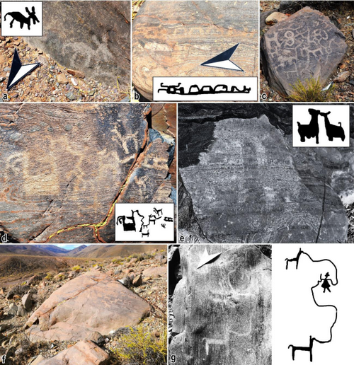 Sobre los agrupamientos de camélidos, observamos que son resultado del uso reiterado de los paneles a través del tiempo –desde el Formativo hasta momentos incaicos–, lo que se desprende de la ausencia de articulación entre ejemplares, las diferencias de pátina y los distintos patrones morfo-estilísticos observados en estos animales. Si bien esta situación también se registra en el Bloque 698 del conjunto Cruz (Figura 5g), varios motivos fueron representados de forma sincrónica, dispuestos en una misma dirección a modo de tropa en marcha, aunque carecen de elementos como lazos o bultos.