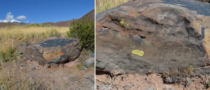 Entre estos últimos conjuntos e Incahuasi hemos también documentado en el pasado, como resultado de prospecciones no sistemáticas, algunos bloques grabados aislados (Figura 1). Por ejemplo, se registró una roca con representaciones de camélidos en la bifurcación entre las quebradas de Las Cuevas e Incahuasi, al pie del sitio formativo La Encrucijada y en proximidad a una extensa vega de fondo de valle. Además, se contaba con información acerca de un gran bloque grabado con motivos de camélidos que denominamos bloque Cruz, cercano a una vega de altura ubicada en una quebrada transversal a Incahuasi (De Feo, 2015, 2018, 2023a, 2023b). Distintas personas nos informaron, asimismo, sobre la presencia de bloques con arte rupestre en quebradas y pasadizos naturales que discurren de forma paralela a la quebrada de Las Cuevas, entre las localidades de Incahuasi y Carrera Muerta (Barbosa y Cahez com pers. 2022).