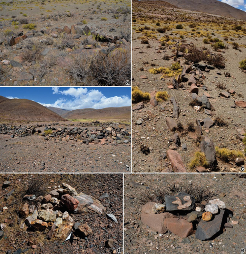 Distante unos 20 m de esta estructura, se registró una pequeña apacheta (sensu Vitry, 2002), conformada por algunos bloques de cuarzo (Figura 7d), y próximos a esta, abundante cantidad de fragmentos de alfarería (n=33) correspondientes algunos de ellos a una olla utilitaria de superficie rojiza alisada, poco diagnóstica de la cronología, y algunas lascas de basalto (n=3) y obsidiana negra (n=2).