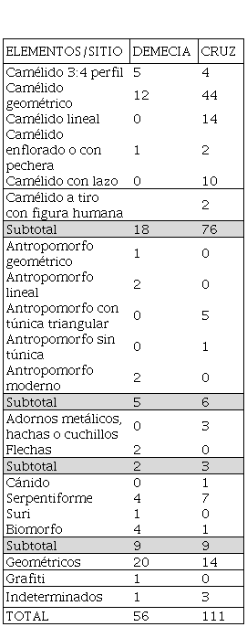 Tal como se desprende de los resultados, los camélidos se encuentran entre los motivos más representados individualmente o porque alrededor del 50% de los bloques incluyen estos animales en temas mayores. Se destacan, por ejemplo, aislados, en pares o en agrupamientos de camélidos dispuestos sobre distintos planos de apoyo y dirección; también combinados en un mismo panel con motivos antropomorfos, geométricos, suris o serpentiformes.